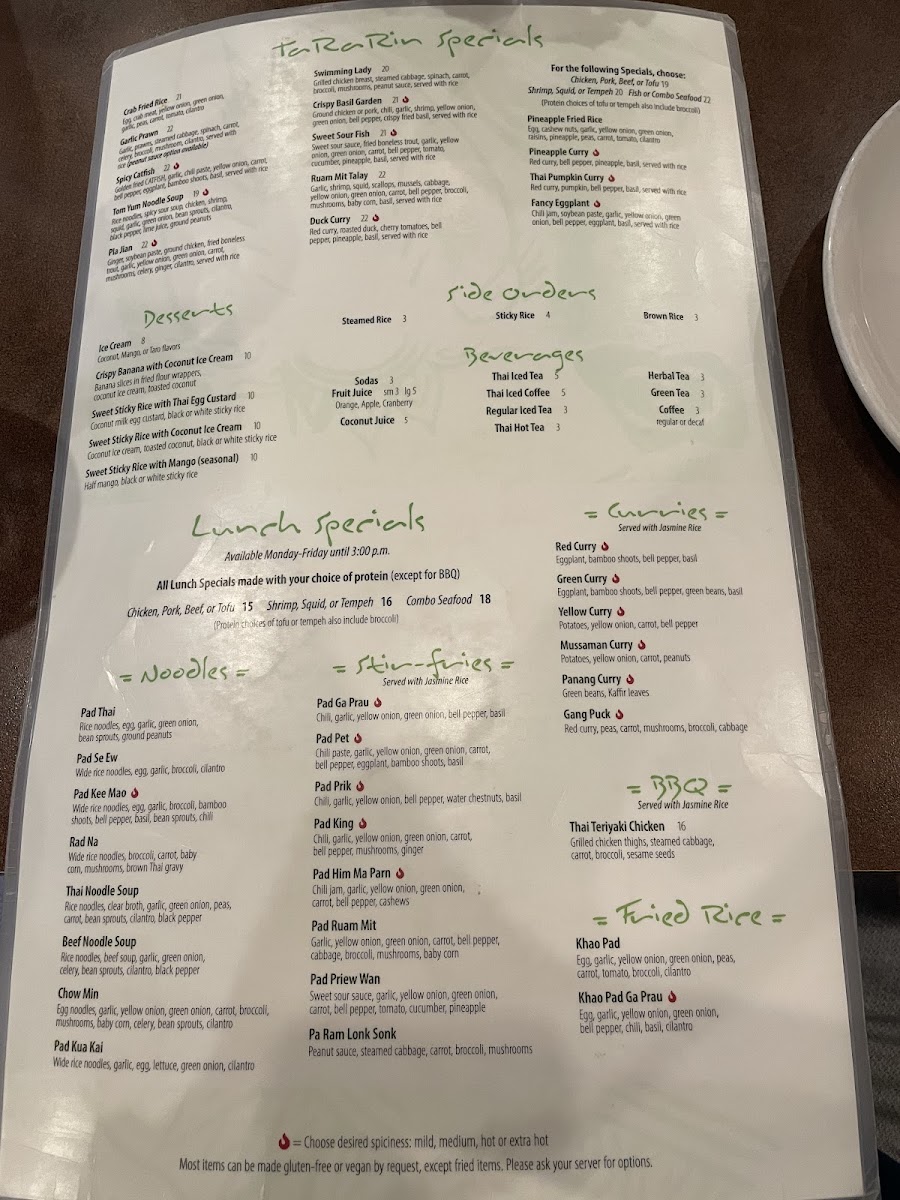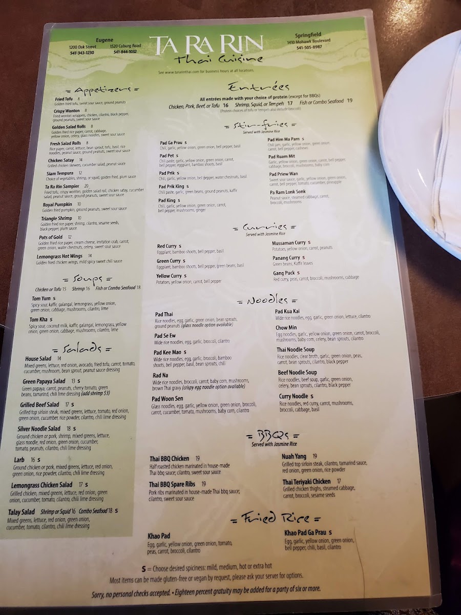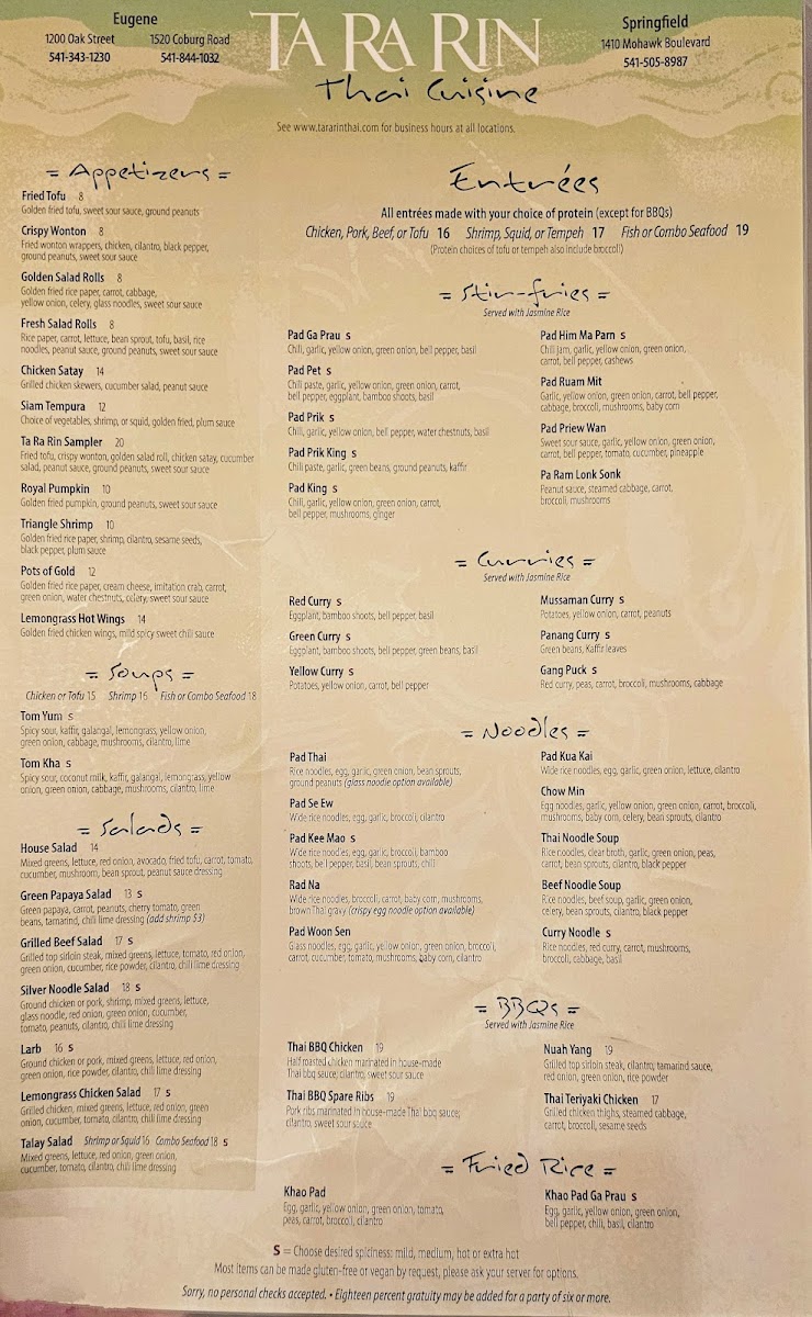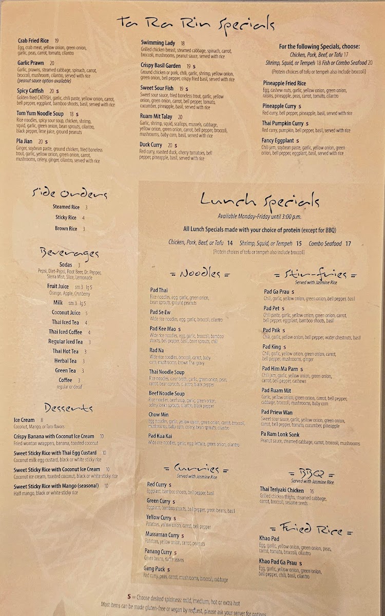 Ta Ra Rin Thai Cuisine (Eugene) Menu